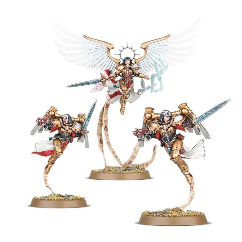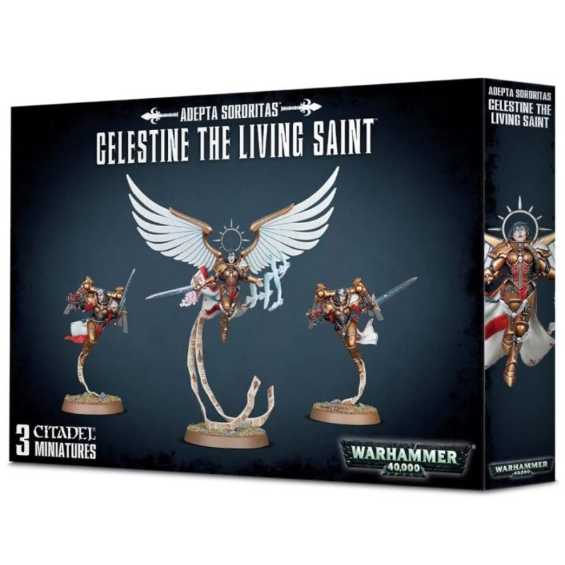Ce kit plastique contient les composants nécessaires pour assembler Celestine the Living Saint, plus les 2 Geminae Superia qui l'accompagnent. Elle porte l'Armure de Sainte Katherine, une plate d'or couverte de saintes icônes et de symboles sculptés. La figurine tient en l'air grâce à un parchemin rattaché à son tabard – et même ce détail n'est rien comparé à l'envergure des ailes qui jaillissent de son paquetage dorsal, ou au halo de fer autour de son visage extatique. La Lame Ardente qu'elle tient de la main droite est ornée de roses, et des colombes s'envolent de sa main gauche. Elle est accompagnée des Geminae Superia, en armure similaire (mais de moindre envergure) qui brandissent leur pistolet bolter et leur épée énergétique d'un air agressif.