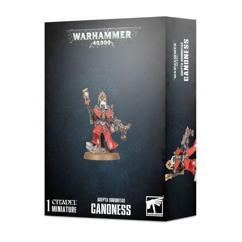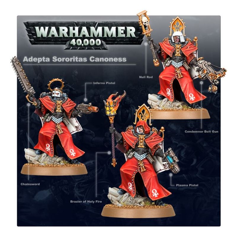 Le kit permet d'assembler une Canoness. Elle peut manier de la main gauche, au choix, un pistolet bolter, un pistolet à plasma, un pistolet Inferno ou un bolter Condemnor. On peut lui faire tenir de la main droite une épée tronçonneuse, une épée énergétique, une lame bénie, un bâton de négation ou un brasero de feu sacré.