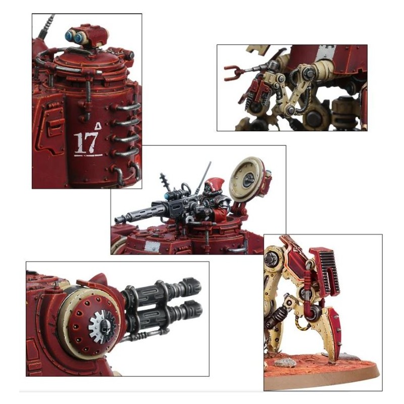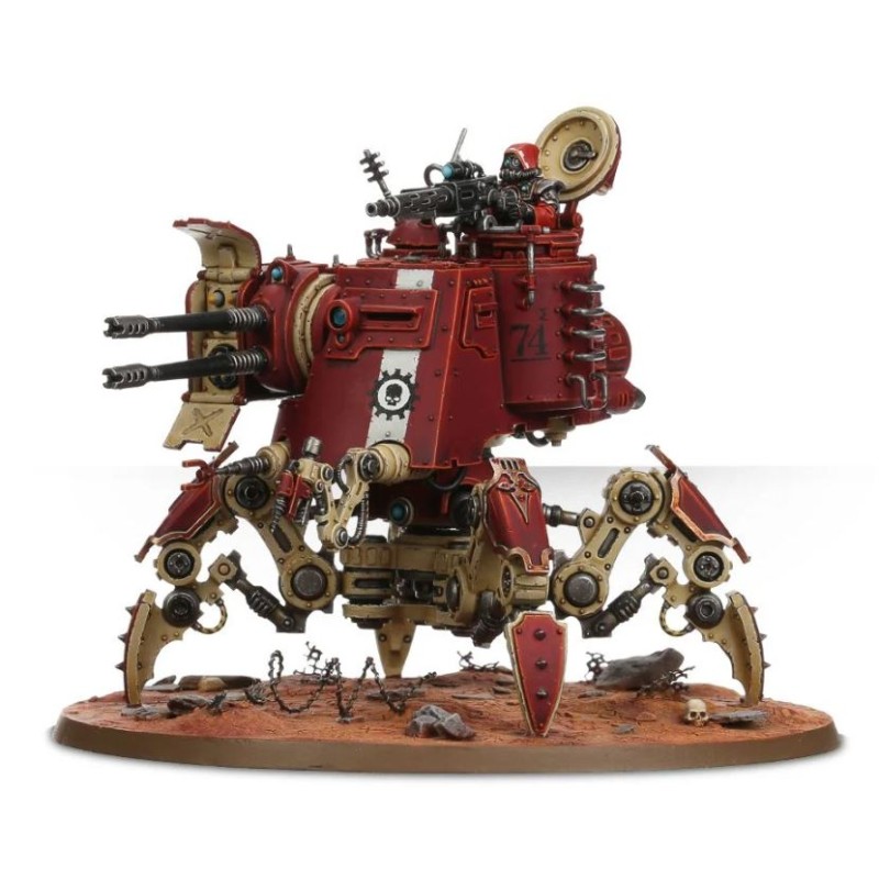 Char marcheur léger, l'Onager Dunecrawler est doté de quatre pattes de crabe avec blindage optionnel. La cabine et le réacteur blindés peuvent accueillir toute une variété d'options de modélisme: projecteurs, fumigènes, manipulateurs Cognis et sondes mentales. La coupole peut être ouverte ou fermée, avec ou sans Princeps servant une mitrailleuse. Avant même de choisir les armes, les possibilités de configuration et de personnalisation sont immenses.