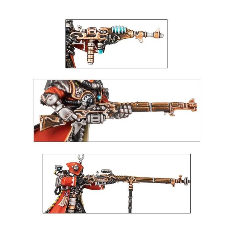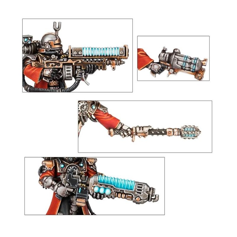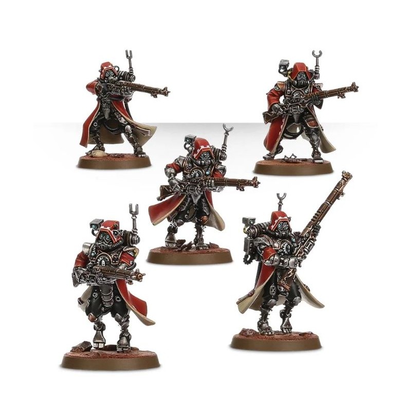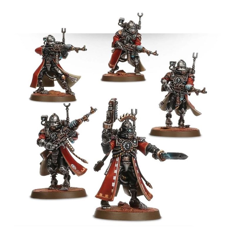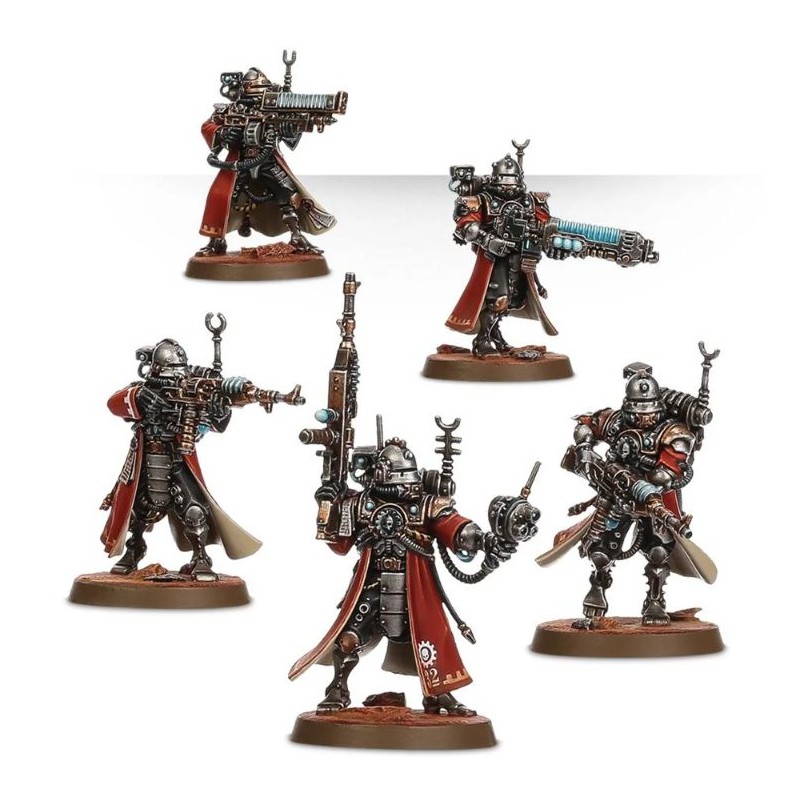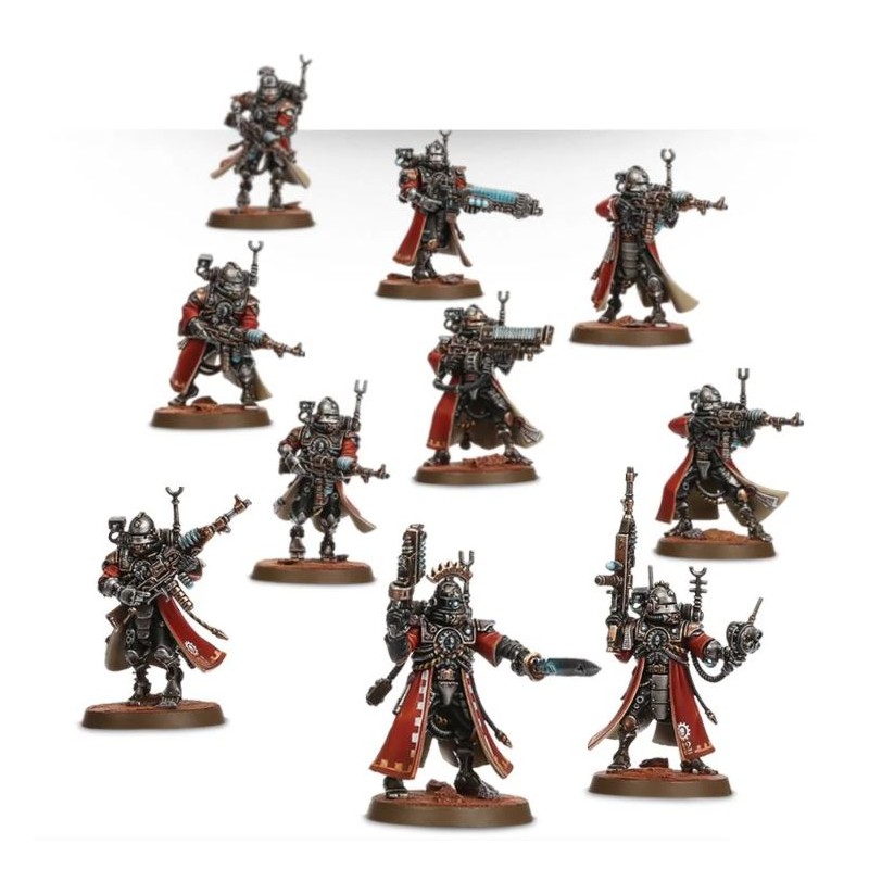 L'unité peut inclure un Alpha, muni d'un pistolet à radium ou d'un électropistolet et d'une arme de corps à corps (épée énergétique, matraque taser ou électromasse) et trois figurines peuvent avoir des armes spéciales. Vous avez accès à une arquebuse transuranique, à un électrofusil et à un tromblon à plasma, ce dernier étant fourni avec une tête et un paquetage spécifique. Une des figurines peut devenir l'Alpha, doté d'un datacâble amélioré ou d'un omnispex; la boîte dépeint véritablement l'obsession de l'Adeptus Mechanicus pour la collecte de données.