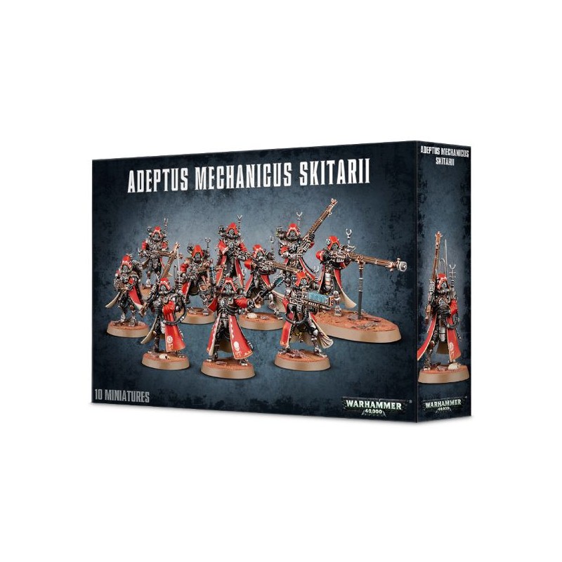 Les Skitarii Vanguard, portant heaume et masque respiratoire, assaillent l'ennemi avec leurs carabines à radium. Chaque soldat est revêtu d'une brigandine Skitarii d'aspect industriel, frappée du symbole de l'Adeptus Mechanicus, hérissée de capteurs de données, d'antennes et de senseurs environnementaux. Du fait du terrain hostile de Mars, ils ont les jambes remplacées en dessous du genou par des prothèses bioniques qui renforcent l'air froid et cybernétique des figurines.
