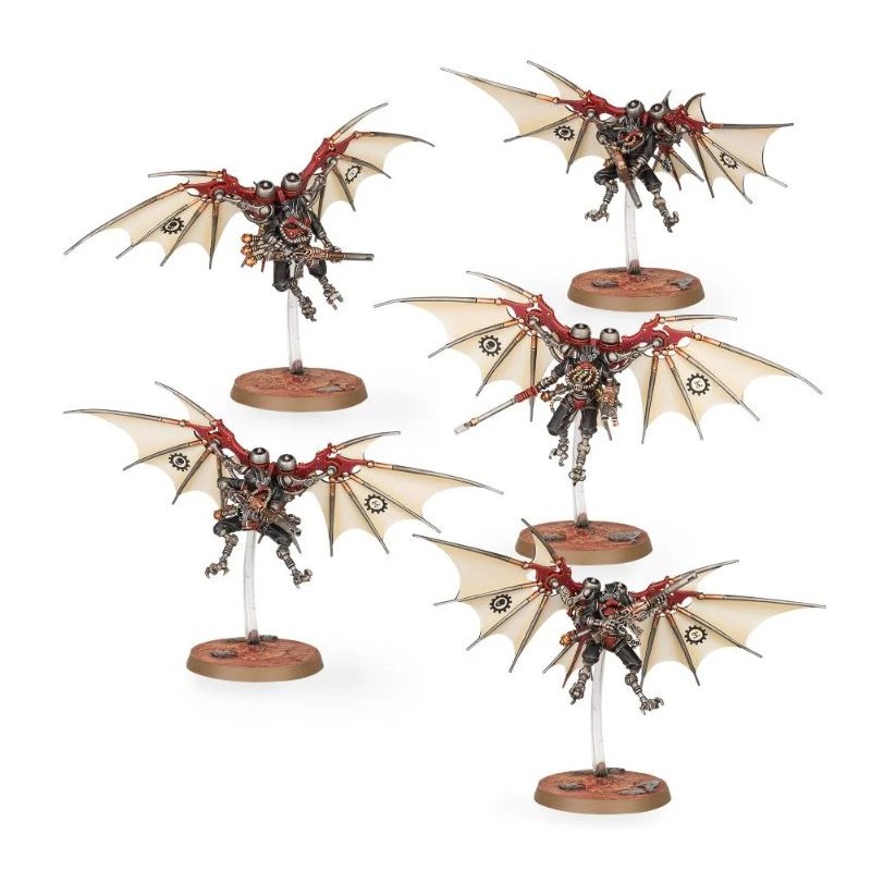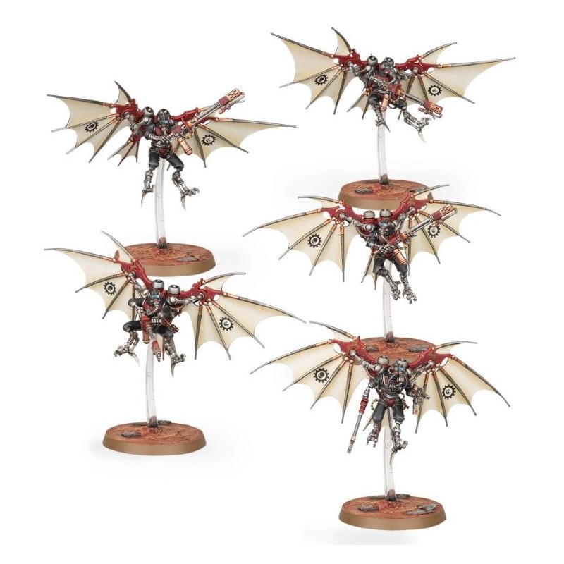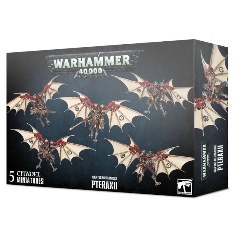 Description du produitLes Pteraxii sont une des nombreuses castes spécialisées de soldats cyborgs dont dispose l’Adeptus Mechanicus, optimisés pour l’agilité et les réactions instinctives. Les réflexes des Pteraxii sont accentués en leur retirant des éléments cognitifs qui gênent leur fonction primaire. On leur implante des articulations supplémentaires sur l’omoplate, un paquetage de propulseurs et des surfaces vivantes réactives. Ces paquetages de vol deviennent une part intégrante des Pteraxii, qui jouent plusieurs rôles. Les Sterylizors, par exemple, sont affûtés pour l’agression, et leurs pieds sont remplacés par des serres acérées. Ils ratissent les temples-forges pour les purger des infestations de techparasites et de cybercloques, et les Tech-Priests n’hésitent pas à utiliser les torches à phosphore des Sterylizors contre les adversaires intelligents.