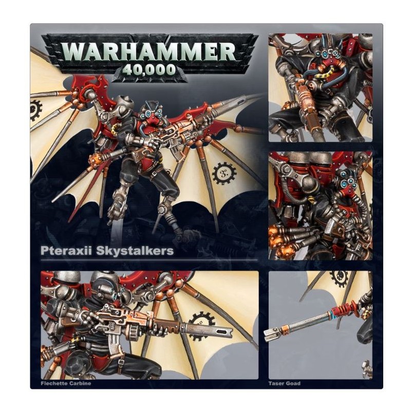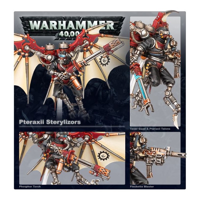 Les Pteraxii Sterylizors portent des chalumeaux à phosphore, de redoutables lance-flammes à tubes allongés, et ils fondent sur leurs proies pour les lacérer de leurs serres de Pteraxii. L'Alpha de l'unité est pour sa part armé d'un éclateur à fléchettes et d'une matraque taser. À eux tous, ils forment une excellente unité d'appui rapproché à vos Skitarii chargés de progresser.