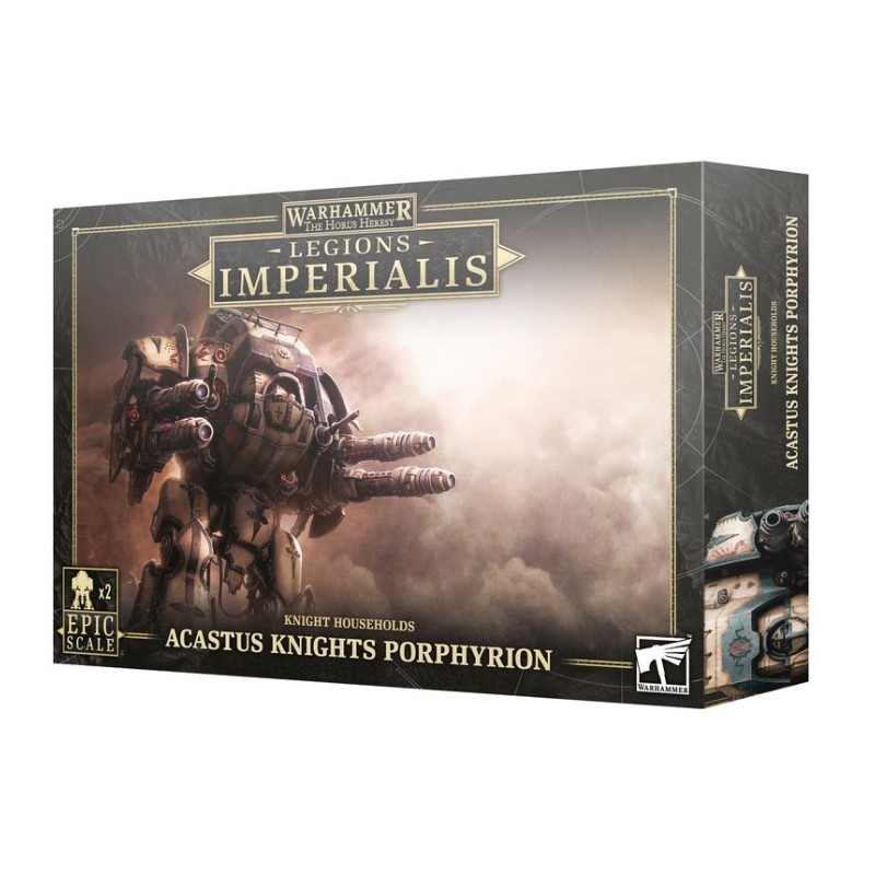 Ce kit plastique permet d'assembler deux Acastus Knight Porphyrion à l'échelle epic. Chacune de ces machines est armée de deux magna-canons laser et peut être dotée soit de missiles de défense Helios ou d'une nacelle lance-missiles Ironstorm, ainsi que de canons laser ou autocanons Acastus montés sur la coque.