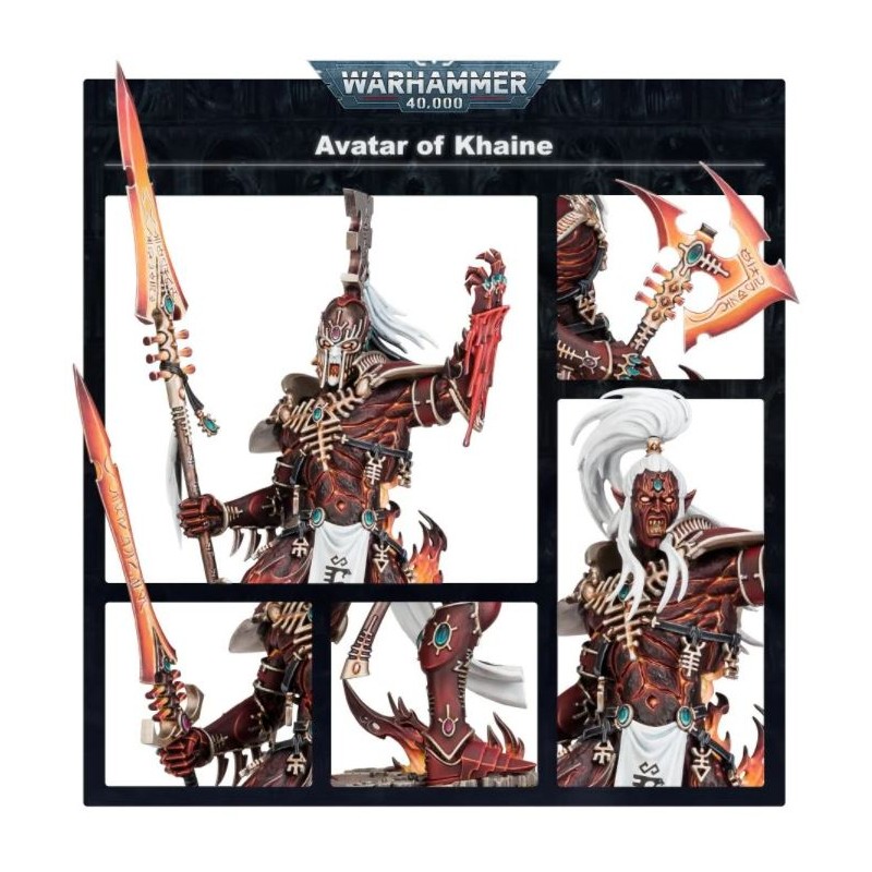 Ce kit permet d'assembler 1 Avatar de Khaine, qui peut être assemblé avec trois options de tête: un heaume classique avec cimier et coiffe, un casque plus martial avec une crête ornementée, ou une tête nue avec une crinière sauvage et un chignon lâché. L'arme divine de l'Avatar, la Mort Hurlante, a elle aussi trois options d'assemblage: une épée gigantesque, une hache cruelle, ou une lance de grande envergure, chacune gravée de runes de puissance.