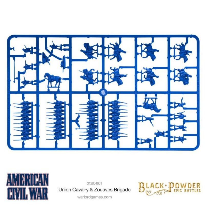 Ce set en plastique fournit suffisamment de modèles pour déployer une brigade complète de l'Union comprenant un régiment de zouaves de 100 hommes, un régiment de cavalerie, un régiment de cavalerie à pied et un régiment de tirailleurs.