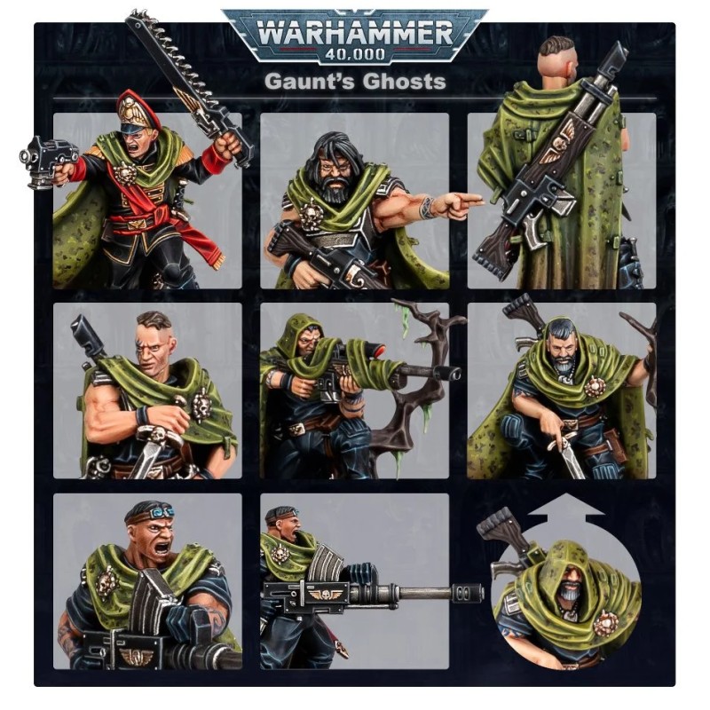 Ce kit plastique en 35 composants permet d'assembler un Colonel-Commissaire Ibram Gaunt, un Colonel Colm Corbec, un Major Elim Rawne, un Maître Sniper Hlaine Larkin, un Bragg “Essaye Encore”, et un Sergent Scout Oan Mkoll. Ce kit est fourni avec 6x socles ronds Citadel de 28,5mm.