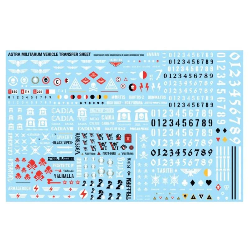 Ce kit est composé de 154 éléments en plastique et est fourni avec 2x socles ronds Citadel de 100 mm. Il contient également une planche de décalcomanies de Véhicules de l'Astra Militarum avec 475 décalcos proposant des numéros, des symboles et diverses héraldiques régimentaires. Ces figurines sont fournies non peintes et nécessitent assemblage