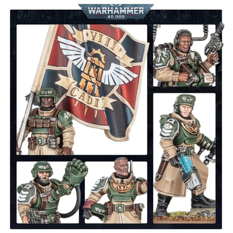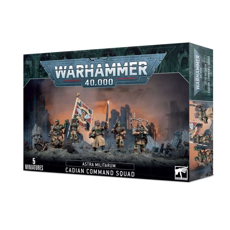 Ce kit plastique permet d'assembler une Escouade de Commandement Cadienne, composée d'un Commandeur Cadien et de quatre Gardes Impériaux Vétérans. Le Commandeur Cadien est armé, selon votre choix, d'un pistolet laser, d'un pistolet bolter ou d'un pistolet à plasma dans une main et d'une épée tronçonneuse, d'une épée énergétique ou d'un gantelet énergétique dans l'autre. Chacun des Vétérans qui l'accompagnent porte un équipement différent : un médic de terrain avec un fusil laser et un médipac ; un opérateur vox avec un pistolet laser et un vox de maître ; un garde du corps avec un pistolet laser et, au choix, une épée tronçonneuse, une épée énergétique ou un gantelet énergétique ; et un porte-étendard avec un fusil laser et un étendard régimentaire. Le garde du corps et le porte-bannière peuvent à la place être assemblés avec une arme spéciale : un lance-flammes, un lance-grenades, un fuseur ou un fusil à plasma.