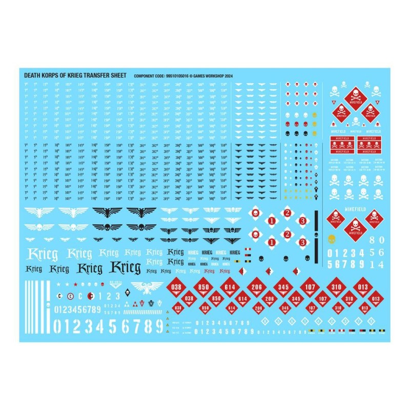 Ce kit est composé de 109 éléments en plastique, de 5x Socles Ronds Citadel de 25mm, et de 1x Socle Rond Citadel de 40mm. Il contient également 1x Planche de Décalcos du Death Korps de Krieg proposant 803x décalcos pour décorer votre figurine.