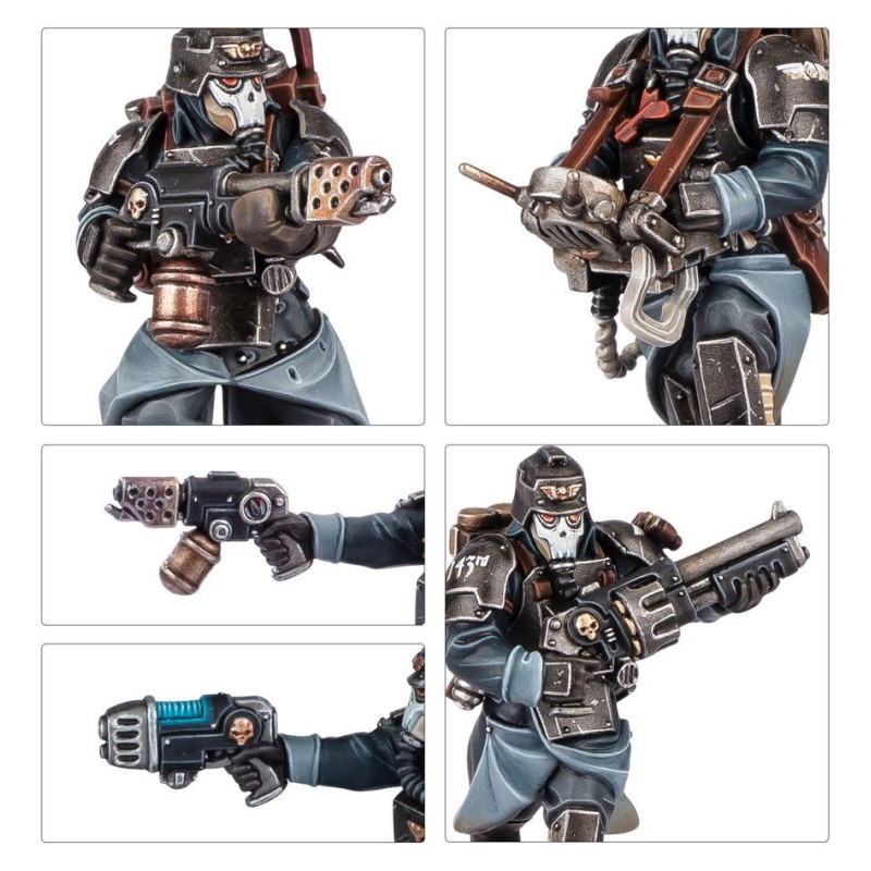 Ce kit contient de nombreuses options pour personnaliser l'apparence de vos figurines et s'assurer qu'elles disposent des bons outils pour les missions que vous leur assignerez. Chaque Sapeur peut être assemblé avec un fusil de combat, ou un pistolet-mitrailleur et une matraque de tranchée. L'un d'entre eux peut être assemblé avec un lance-flammes, et un autre peut être équipé d'un contrôleur de mine télécommandée. Enfin, l'un d'entre eux peut être assemblé en tant que Maître du Guet et armé d'un pistolet bolter, d'un pistolet-mitrailleur, d'un pistolet à plasma, d'un lance-flammes léger ou d'un fusil de combat, et d'une épée tronçonneuse, d'une arme énergétique, d'une matraque de tranchée ou d'une grenade.