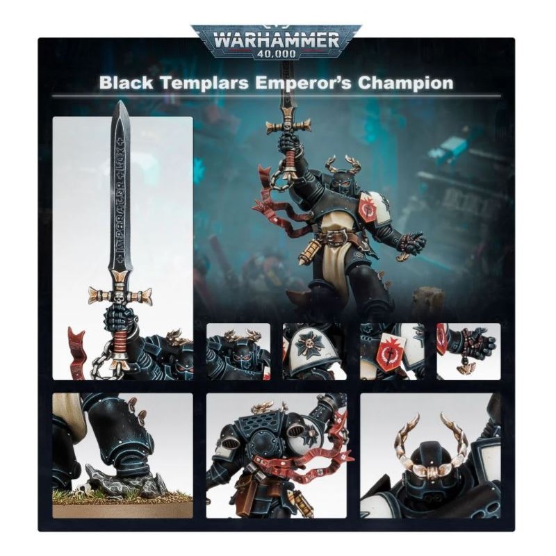 Auréolé de lumière dorée, cet implacable guerrier peut ignorer d'innombrables blessures, et en retour, abattre d'innombrables ennemis. Son équipement sacré est entreposé dans le Reclusiam des Black Templars, et si le Champion devait faillir, on lancerait des croisades pour retrouver ces saintes armes.