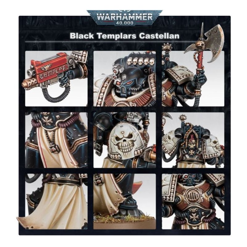Basé sur l'illustration Black Templars emblématique de John Blanche, ce Castellan apporte les effets d'amélioration d'un lieutenant avec un style unique. Couvert d'effigies de crânes, maniant un combi-lance-flammes et une hache énergétique de maître, cette figurine distinctive est le moyen idéal d'ajouter une touche rétro à votre force de Black Templars.