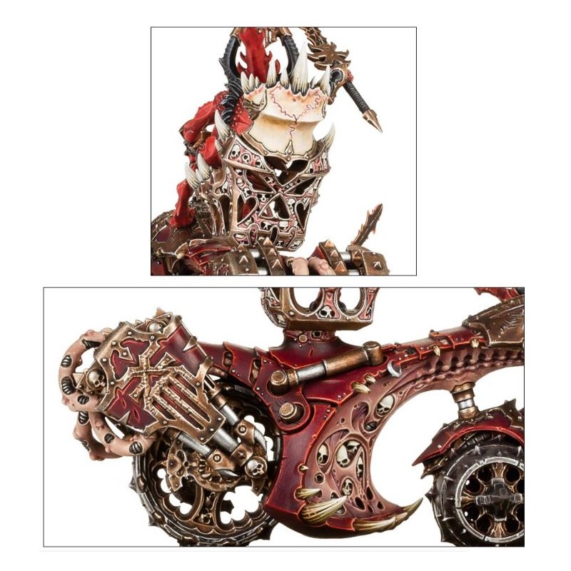 Le canon à crânes de Khorne une création mécanique monstrueuse, hybride de chairs et de machine démoniaque, et ornées d’icônes de Khorne. Le châssis de ces deux variantes est imposant et figure une gueule grande ouverte qui avance soutenue par des roues cylindriques hérissées de piques. Le reste fait immanquablement penser à une machine, avec des tubes de métal, des câbles et des pistons, ainsi que des cornes, des crânes, des piques et des motifs en forme de gueule béante. Au sommet de la machine se dresse un canon massif auquel deux sanguinaires sont enchaînés. Cette arme colossale est détaillée avec des crânes et des dents en métal, tandis que l’extrémité du canon figure une gueule ouverte et menaçante.