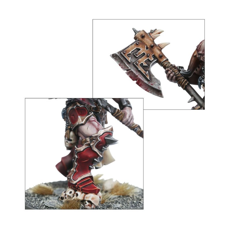 Description du produitDominant ses frères Bloodbound, le visage figé en un rictus de haine permanent, le Slaughterpriest est imbu de la force rageuse du Chaos. Un tel démagogue est capable de faire bouillir le sang de ses ennemis en rugissant une prière, ou de remplir son entourage d'une frénésie insensée par des incantations tonitruantes, jusqu'à ce que tous se ruent au combat sans le moindre égard pour leur propre survie. Les Slaughterpriests sont réputés obtenir leurs pouvoirs hideux en buvant le sang de leurs victimes; ce macabre hommage à Khorne fait grandir leurs membres et durcir leurs os, ce qui en fait des brutes redoutées à juste titre à travers les Royaumes.