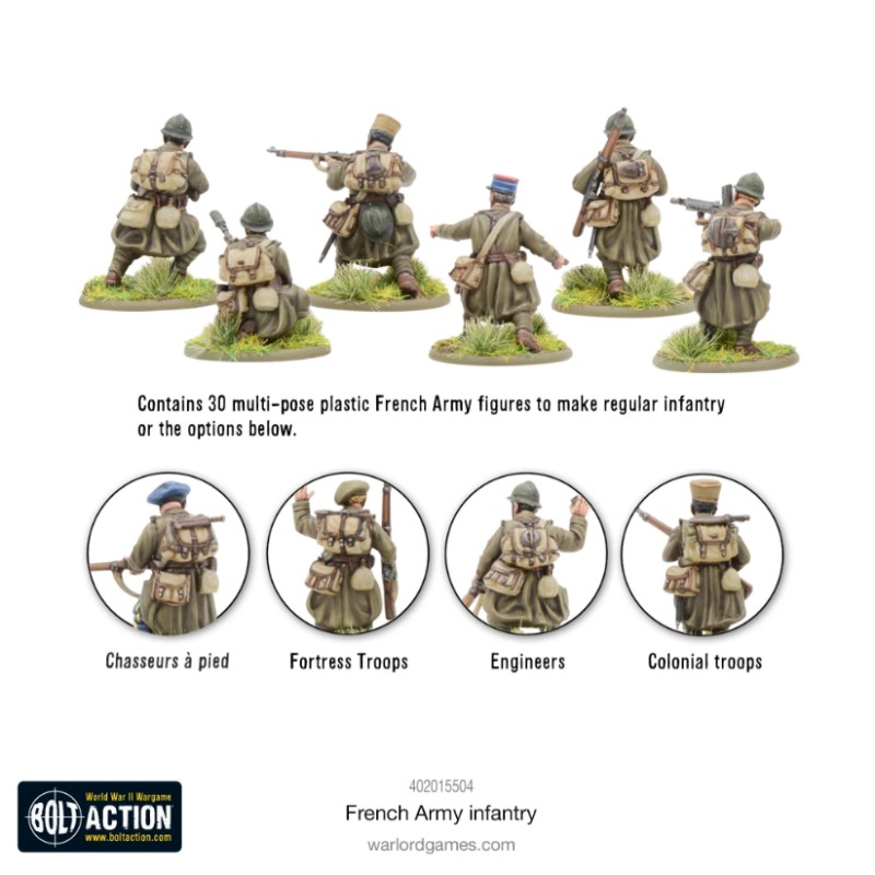 Ce coffret en plastique incroyablement polyvalent vous permet d'assembler les figurines en tant qu'infanterie régulière de l'armée française, troupes de forteresse, chasseurs à pied, ingénieurs ou troupes coloniales (algériennes, marocaines ou tunisiennes).