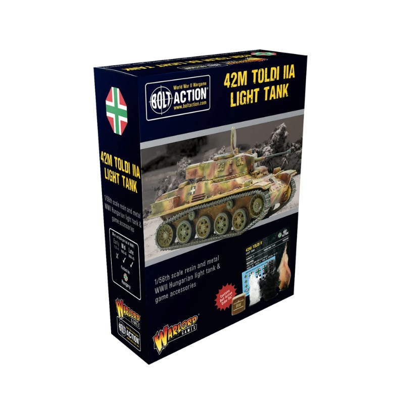 La boîte contient un char léger Toldi Iia de 42M, en résine et en métal, avec une feuille de décalcomanies, un dé d'ordre Bolt Action, une carte de statut de véhicule Bolt Action : Third Edition et des marqueurs de dégâts.