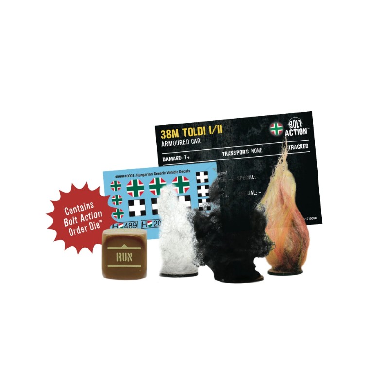 La boîte contient un char léger 38M Toldi I/II, en résine et en métal, avec une feuille de décalcomanies, un dé d'ordre Bolt Action, une carte de statut de véhicule Bolt Action : Third Edition et des marqueurs de dégâts pour les véhicules.