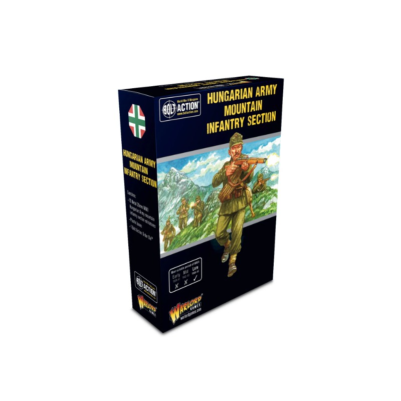 La boîte contient dix fantassins de montagne de l'armée hongroise (sous-officier avec SMG, un homme armé d'un LMG, un homme armé d'un SMG, sept fusiliers), en métal moulé, avec un dé d'ordre Bolt Action et des socles en plastique.