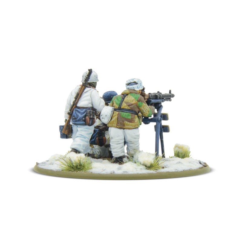 Contient une mitrailleuse moyenne en métal, trois Fallschirmjäger (hiver) en résine Warlord et un socle en plastique.