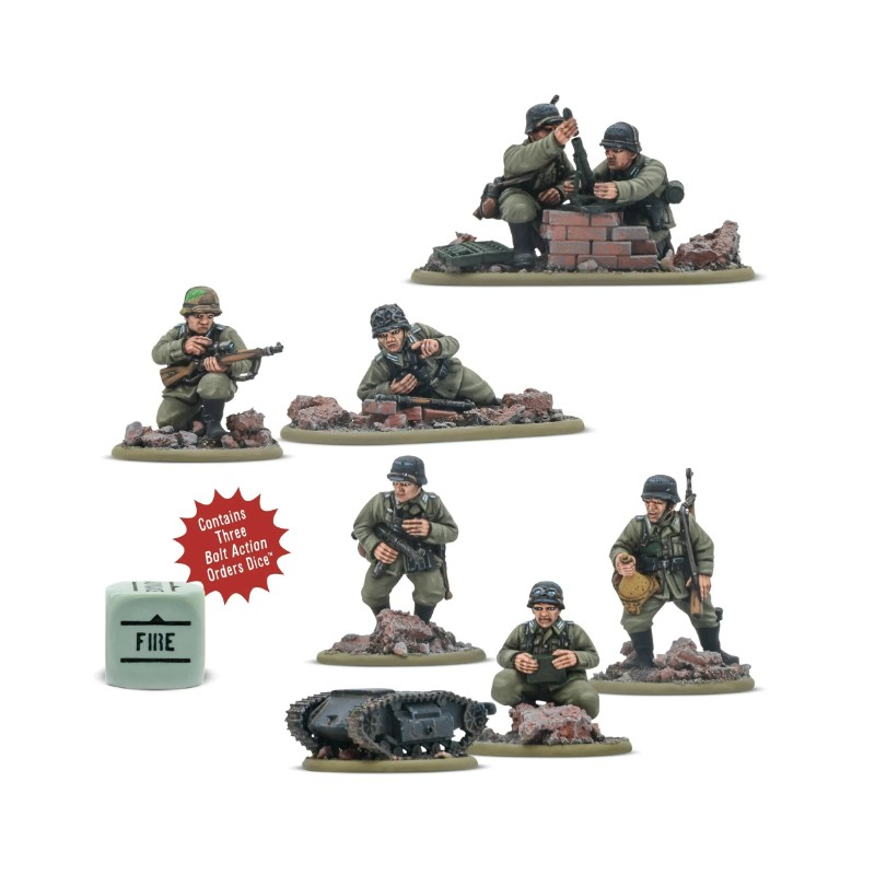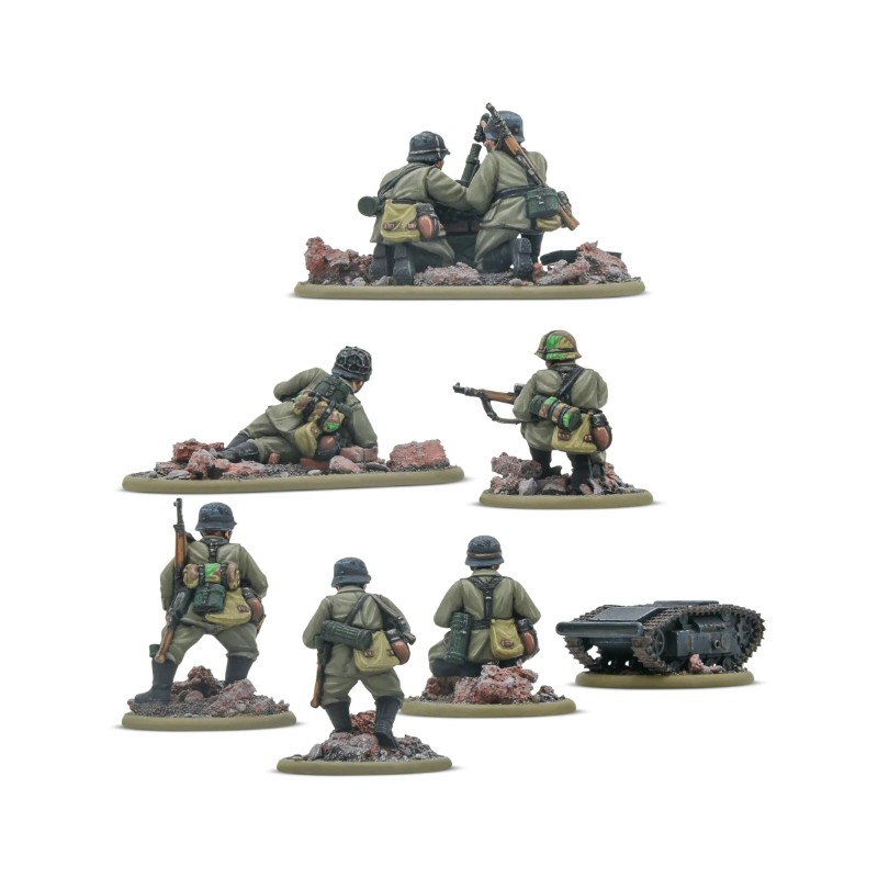 Cette boîte vous fournit trois équipes d'armes pour soutenir votre infanterie de vétérans allemands, équipées pour les combats rapprochés. Une équipe de tireurs d'élite menace les officiers et observateurs ennemis, tandis qu'une équipe de mortiers légers effectue des tirs indirects à courte portée pour soutenir vos pelotons de fusiliers. Enfin, la mine télécommandée Goliath, unique et puissante, peut être déployée pour démolir les fortifications les plus solides.