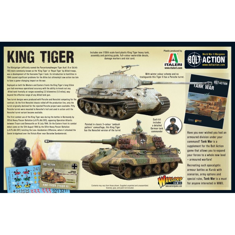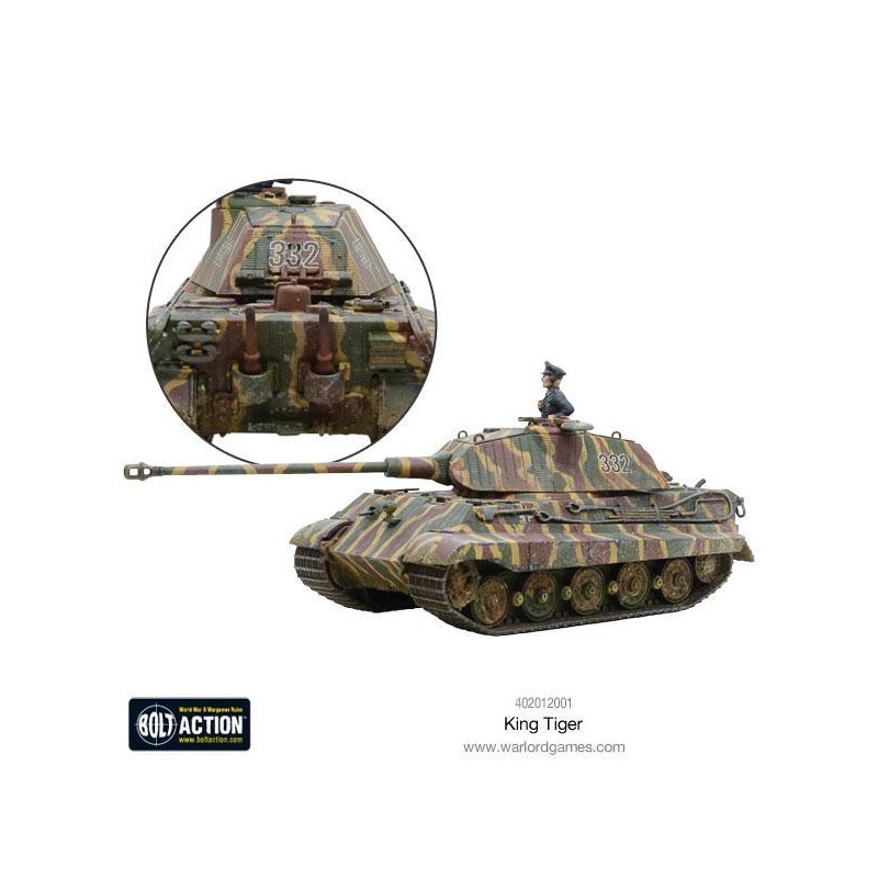 Description du produitLe Königstiger (officiellement appelé Panzerkampfwagen Tiger Ausf. B ou Sd. kfz 182) plus communément appelé le "King Tiger" ou "Royal Tiger" par les troupes alliées, était un développement du redoutable Tiger I. Son introduction en 1944 a causé d'importants problèmes aux Alliés, mais en fin de compte, il est intervenu trop tardivement et de manière trop réduite pour avoir un impact décisif sur la guerre.