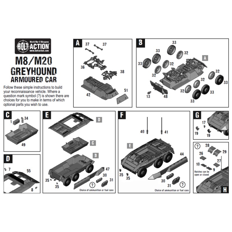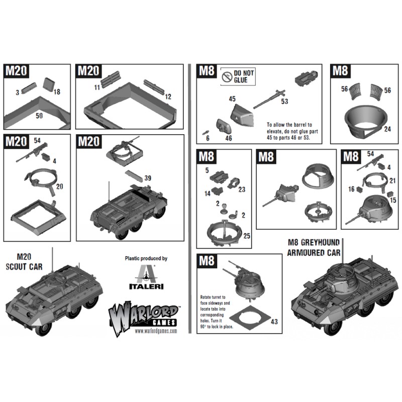 Description du produitLe M8 Greyhound était une voiture blindée efficace et populaire qui rendit de bons et loyaux services aux armées britanniques et américaines durant la guerre. Il était très rapide, d’où le nom de Greyhound (« l évrier ») donné par les Britanniques, capable d’atteindre une vitesse de 89 km/h sur route, mais avait la réputation de s’enliser dans la boue. Son blindage était suffisant pour repousser les tirs d’armes légères. Le M8 était d’autant plus efficace lorsqu’on le déployait par paire lors des missions de reconnaissance contr e les lignes ennemies : les deux véhicules se soutenaient et se couvraient ains i mutuellement lors de l’avancée ou d’un repli, progressant à tour de rôle . Cette boîte vous permet d’assembler un véhicule en plastique dans deux versions différentes : le M8 avec sa tourelle et so n canon de 37mm ou le M20
