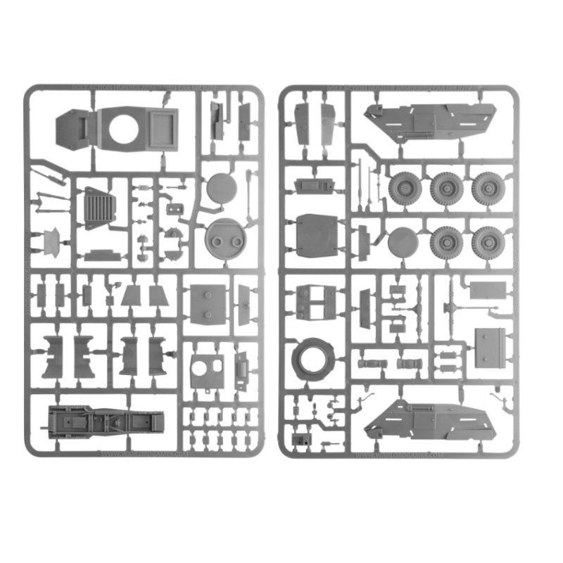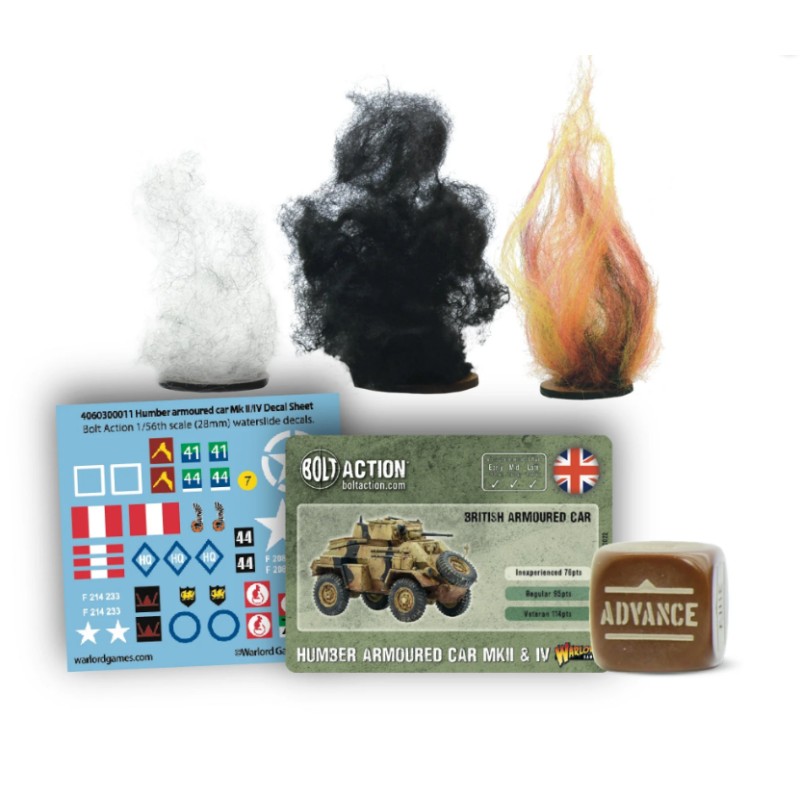 Comprend un modèle de véhicule blindé Humber en plastique, des dés d'ordre Bolt Action, une carte de statut Bolt Action, des marqueurs de dommages aux véhicules, un livret d'assemblage et une feuille de décalcomanies à l'eau en couleur pour les véhicules britanniques, du Commonwealth et polonais.