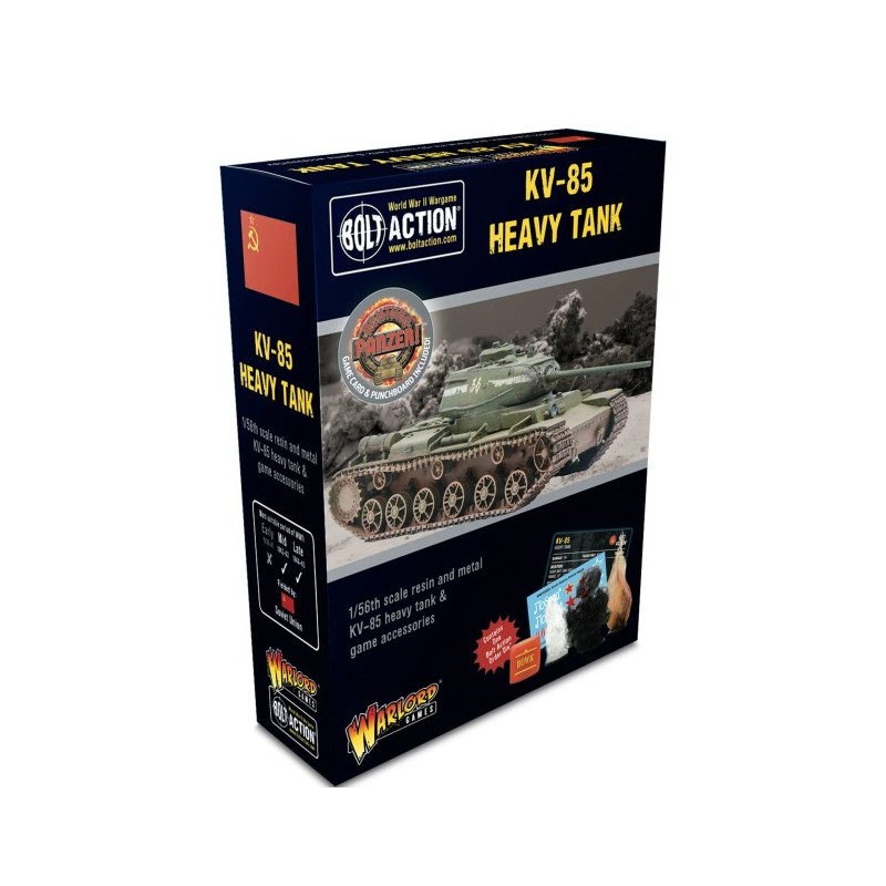 La boîte contient un char lourd KV-85 en résine et métal, des dés de commande Bolt Action, des décalcomanies à l'eau, une carte de statistiques Bolt Action: Third Edition et une carte de données et des jetons de char Achtung Panzer!.