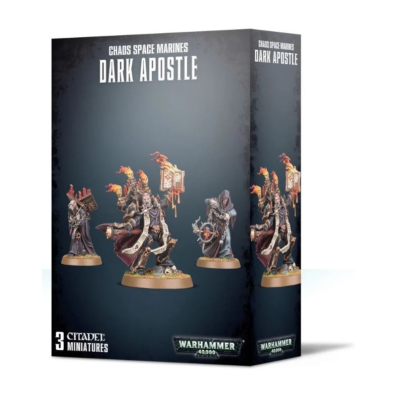 L'ensemble de Dark Apostle se compose d'un kit plastique permettant de monter trois figurines. Le Dark Apostle est un choix QG incontournable pour toute armée de Chaos Space Marines, qui peut s'accompagner d'un duo de Dark Disciples. Le Dark Apostle est muni d'un crozius maudit et d'un grimoire démoniaque. Au combat, il peut adresser des prières aux dieux sombres pour solliciter leurs bienfaits. Les reliques de corruption que portent les Dark Disciples assistent leur maître dans ses suppliques aux dieux du Chaos.