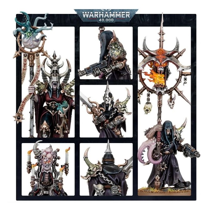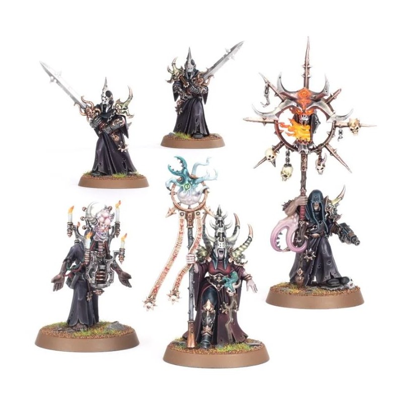 Ce kit plastique permet d'assembler les cinq figurines d'une Sombre Communion : une Démagogue du Culte, un Icônarque, un Mentasorcier et deux Lames Bénies. Les membres de cette cabale démente arborent de sombres robes, des talismans et des masques démoniaques rappelant ceux de leurs disciples Cultistes du Chaos. Mais l'apparence de chacun indique clairement son rôle. La Démagogue du Culte porte un grand masque cornu et des épaulières et elle manie un bâton surmonté de bandes de parchemins et d'un infâme familier, tandis que l'Icônarque tient une icône démoniaque baignée de flammes, son visage dissimulé par une capuche. Tous deux arborent des tentacules, mais le Mentasorcier est de loin le plus dérangeant : une tête tranchée et boursouflée est cybernétiquement reliée au corps d'un cultiste encagoulé. Les Lames Bénies sans visage manient chacun une épée rituelle ornementée et se tiennent prêts à protéger la Communion.