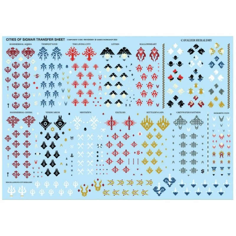 Ce kit comprend 27 composants plastique et un socle ovale Citadel de 75x42mm. Également incluse, une planche de décalcomanies des Cités de Sigmar, avec 410 icônes de Cité Franche, des symboles du culte de Sigmar et autres formes d'héraldique.