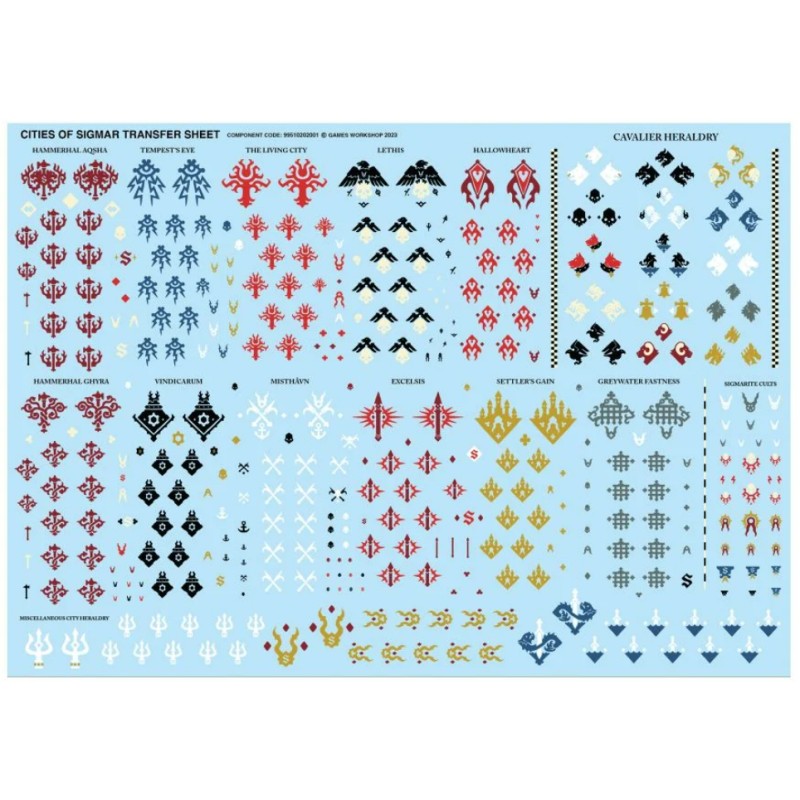 Ce kit comprend 61 composants plastique et un socle rond Citadel de 90mm. Également incluse, une planche de décalcomanies des Cités de Sigmar, avec 410 icônes de Cité Franche, des symboles du culte de Sigmar et autres formes d'héraldique.