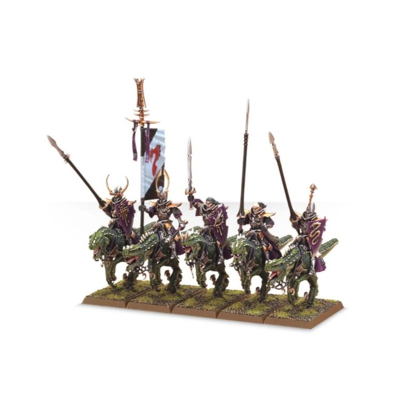Description du produitLes Drakenspawn Knights comptent parmi les guerriers les plus redoutés de l'Order Serpentis. Le talent des chevaliers et la férocité de leurs montures les placent au-dessus des cavaleries des espèces inférieures. En dépit d'effectifs limités, la brutalité des Drakenspawn knights est une arme décisive au point de pouvoir remporter une âpre bataille en une seule charge dévastatrice.