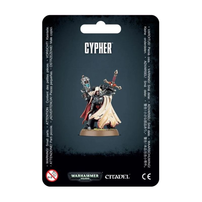 Ce kit plastique contient les composants nécessaires pour assembler Cypher, Lord of the Fallen. Il porte un équipement archaïque et hétéroclite, car en tant que renégat dépourvu des ressources d'un Chapitre, Cypher se débrouille avec ce qu'il trouve. Son paquetage dorsal a été réparé tant et plus au cours des siècles, et son armure comporte des pièces de plusieurs modèles différents. Il est armé d'un pistolet bolter et d'un pistolet à plasma pourvu d'un dissipeur thermique externe. Outre sa cape et sa capuche usées et trouées, on remarque surtout l'épée imposante qu'il porte dans le dos. Nul ne peut confirmer s'il s'agit ou non de l'Épée du Lion, et si c'est bien elle, les intentions insondables de Cypher sont d'autant plus intéressantes…