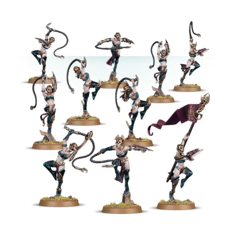 Description du produitMaîtresses impitoyables du fouet, les Sisters of Slaughter se jettent dans la mêlée et ne cessent de frapper que quand tous leurs ennemis sont morts. Mais cela ne suffit pas toujours, car pour ces tueuses féroces, mutilations et bains de sang sont des actes de dévotion envers leur cruelle divinité. La vie entière des Sisters of Slaughter tourne autour du combat. La mêlée est une prière, et chaque goutte de sang est une offrande à Khaine. Leur style de combat est très démonstratif, fait de pirouettes, de sauts et de poses dramatiques, et elles se servent de leurs fouets et de leurs lames pour graver d’antiques runes dans la chair de l’ennemi. Celles qui rejoignent définitivement cette sororité se font greffer une fois pour toutes un masque hideux de métal vivant – celles qui survivent à l'opération et aux duels cérémoniaux suivants deviennent des gladiatrices follement dévouées au combat au nom de Khaine.