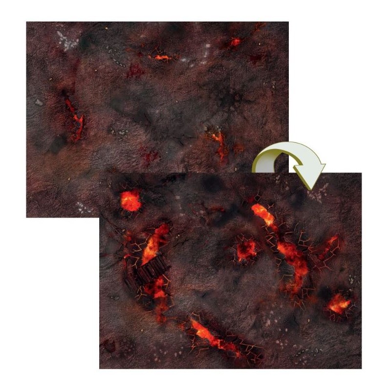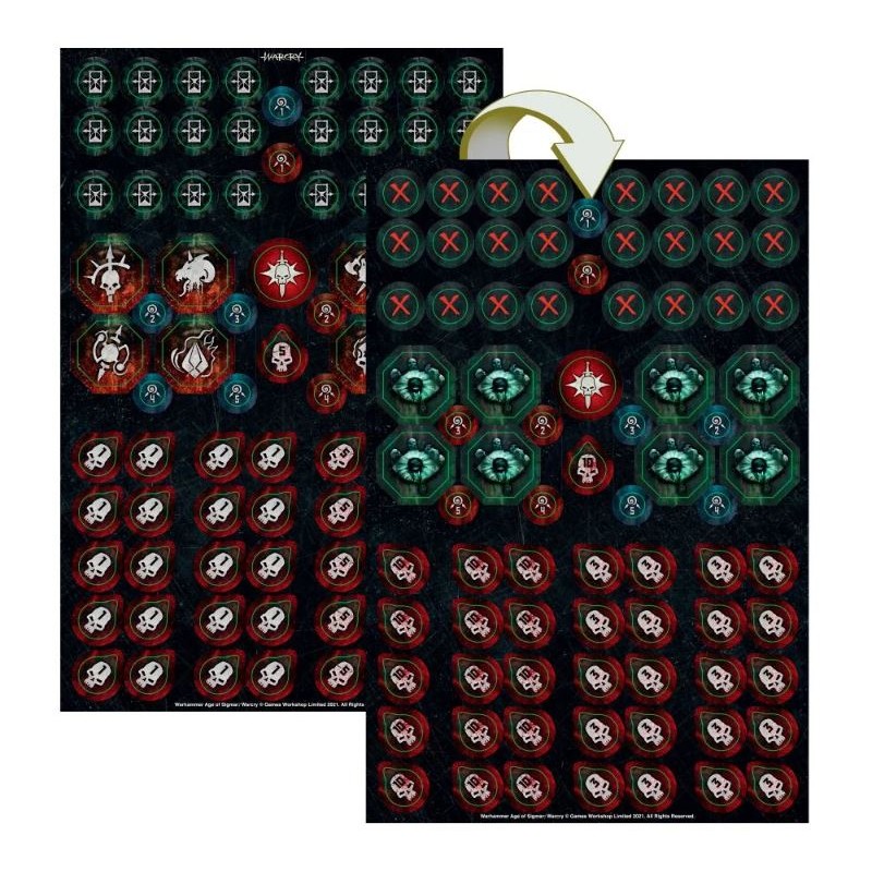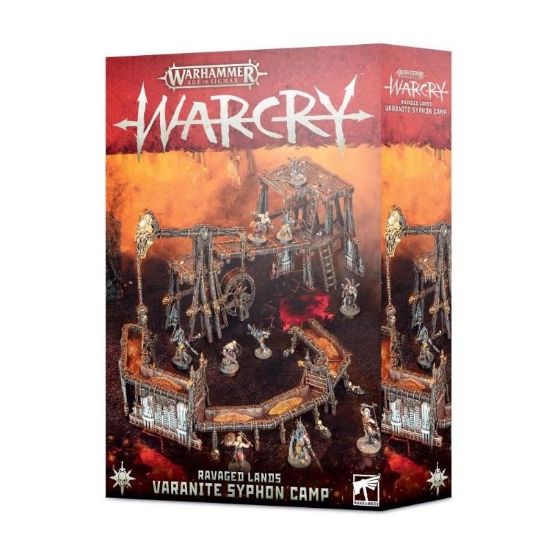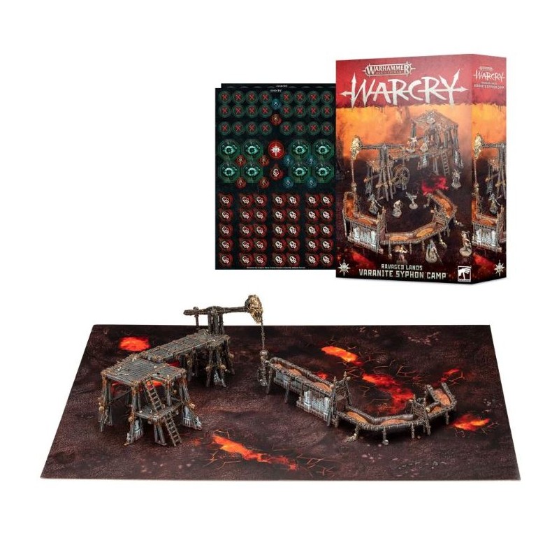 La boîte inclut aussi un champ de bataille de Dépôt de Varanite – un plateau de jeu double face pliant de 22" x 30", la taille parfaite pour des parties de Warcry. Une face représente les fosses en fusion d'une mine de varanite, et l'autre un désert de cendre courant aux Huit-points. Elle contient également deux feuilles de pions double face, pour un total de 79 pions permettant de suivre les activations, les objectifs, les dégâts et d'autres choses lors de vos parties de Warcry.
