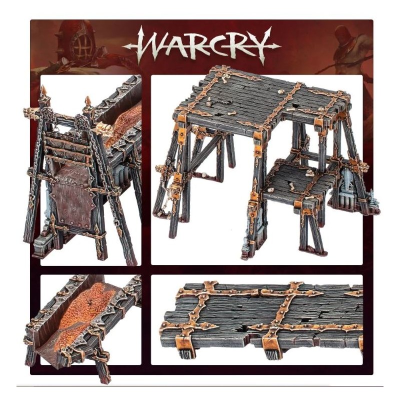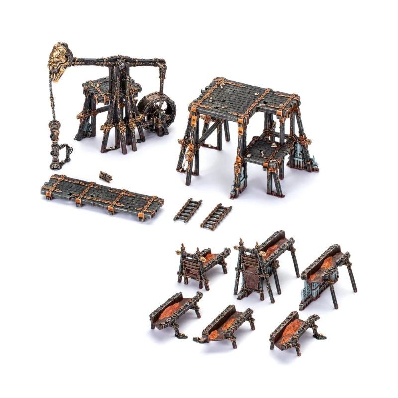 Ces terrains peuvent être reliés sans colle pour créer une grande variété de configurations, vous permettant d'ajuster votre réseau de Structures en Bois, Passerelles et Canaux à vos besoins de jeu. Ils sont en outre entièrement compatibles avec le set de Terres Ravagées: Camp de Drague-fosse, vous permettant de bâtir, redisposer et d'agrandir un immense complexe minier modulaire. D'ailleurs, rien ne vous limite à Warcry – ces terrains peuvent être utilisés à Warhammer Age of Sigmar, ou dans tout autre environnement que vous jugez approprié.