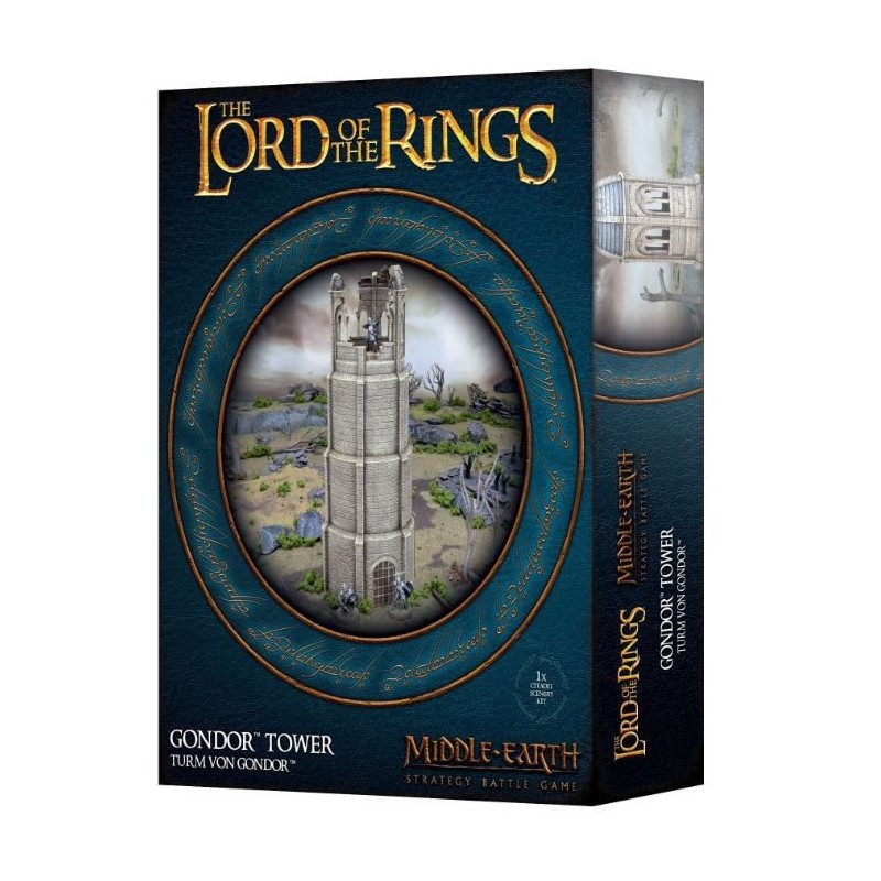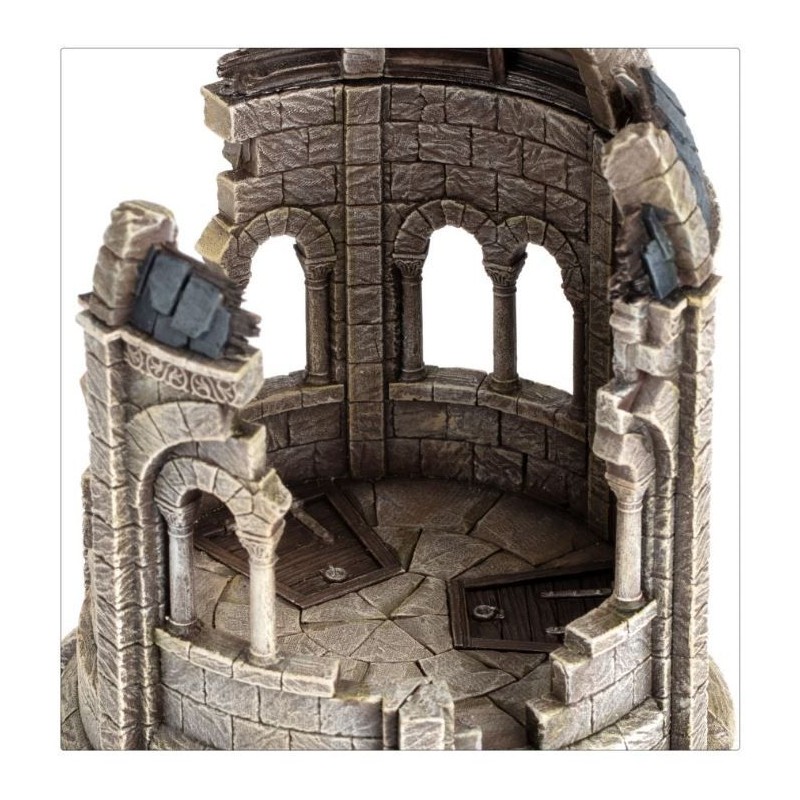 Ce kit plastique permet d'assembler une Gondor Tower, une puissante flèche de pierre robuste, avec des portes en bois renforcées de fer. Cette tour mesure environ 30cm de haut et peut être dotée d'une, deux ou trois portes. Vous pouvez assembler le toit en ruines, comme s'il avait été détruit par un tir de catapulte ou par les ravages du temps, avec des gravats supplémentaires pour décorer sa base. Vous pouvez également assembler une tour intacte avec toit en forme de dôme, conçu pour être monté sans colle, ce qui vous permet de le retirer et de combattre à l'intérieur en cours de partie. Quoi qu'il en soit, le toit détaillé offre assez de place pour placer vos figurines à l'intérieur.