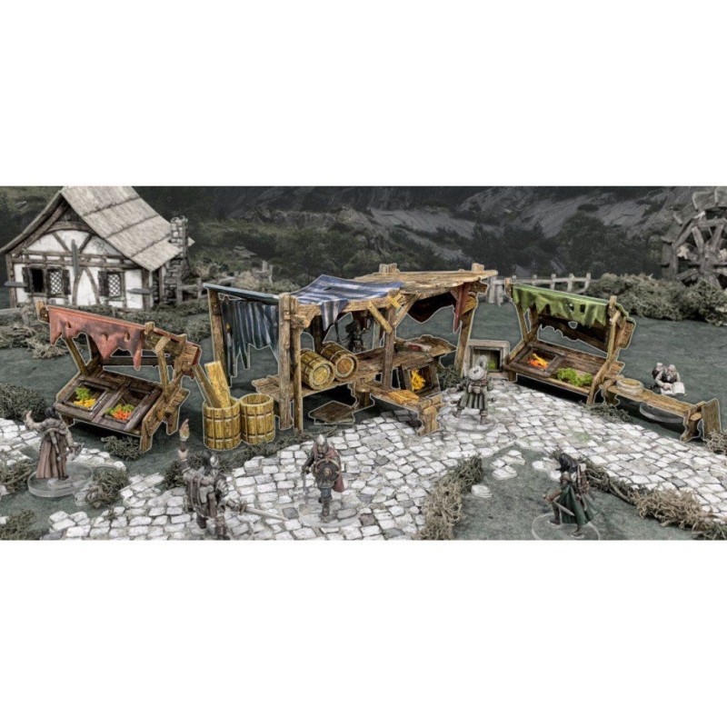 Battle Systems: Marketplace (déjà inclus dans le Battle Systems: Fantasy Citadel) comprend 3étals de marché et ses accessoires. En carton peint et prédécoupé, ce décor est à assembler.