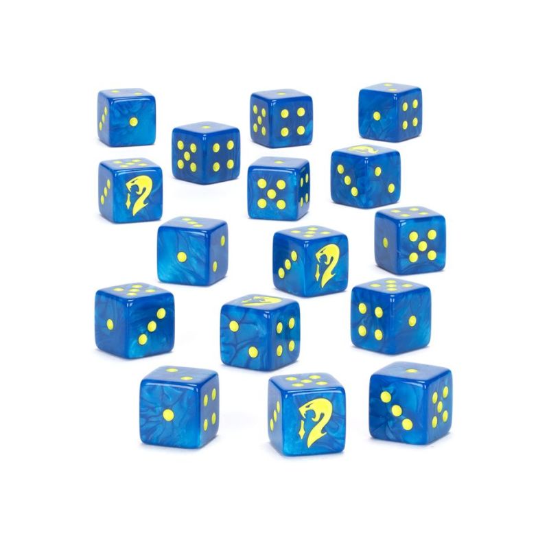 Ce set de 16 dés aux arêtes carrées pour les parties de Warhammer 40,000 est sur le thème des Drukhari. Ils sont moulés en plastique acrylique bleu nacré avec des marquages jaunes et mesurent 16mm de côté. Les faces 1 à 5 sont numérotées de manière traditionnelle et chaque face du 6 porte l'icône de la Kabale de la Langue Venimeuse.