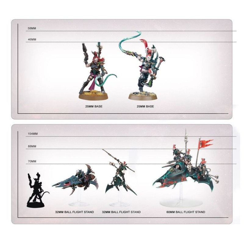 Ce kit est composé de 377 éléments en plastique, de 12x Socles Ronds Citadel de 25mm, de 8x Petits Socles de Vol Citadel, de 16x Tiges de Vol à Rotule Citadel et de 2x Grands Socles de Vol. Ces figurines sont fournies non peintes et nécessitent assemblage