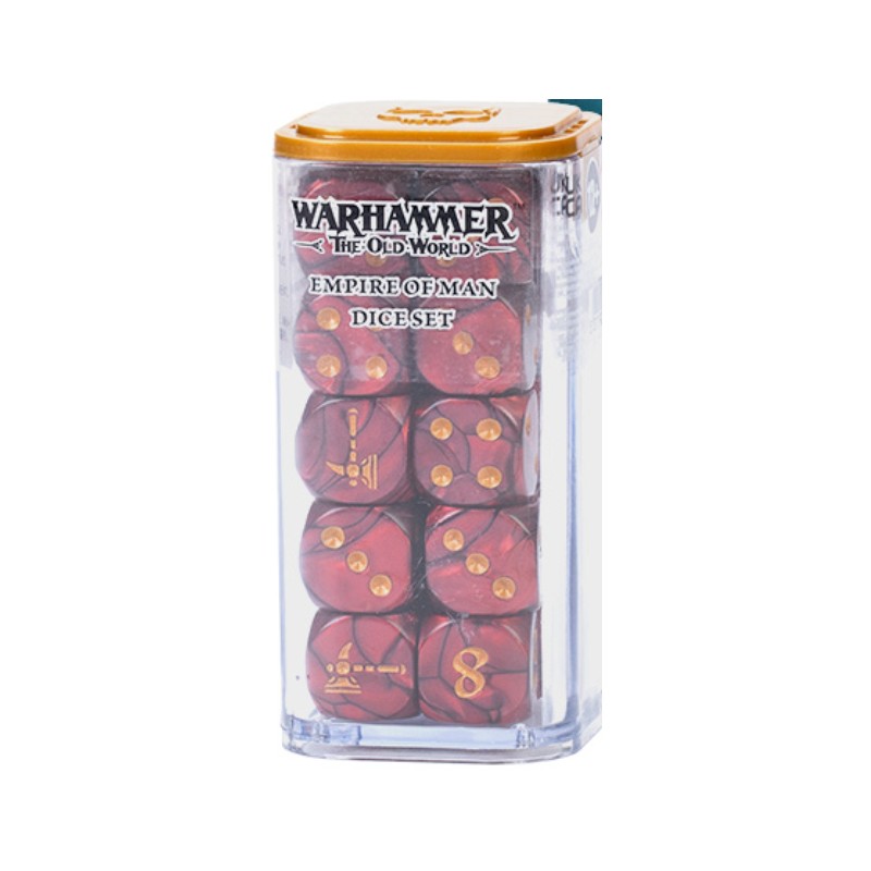 Ce set inclut 20 dés sur le thème de l'Empire de l'Homme. Ils sont moulés en plastique rouge nacré avec des marquages dorés. Les dés à six faces arborent fièrement une icône stylisée du Marteau de Guerre de Sigmar sur la face du 6.
