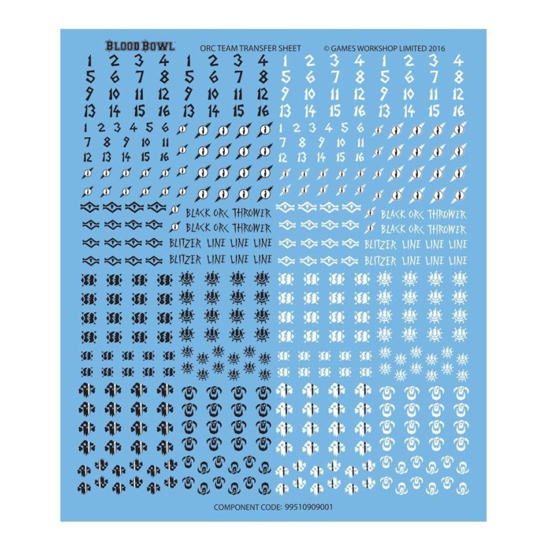 Cette boîte contient 12 joueurs de Blood Bowl orques en plastique – 2 blitzers, 2 throwers, 2 Black Orc blockers et 6 linemen. Fournis avec des ballons supplémentaires, des pions d'équipe, une planche de décalcomanies couverte de symboles orques et 12 socles ronds de 32mm pour Blood Bowl, avec un trou pour y fixer le ballon quand il est en votre possession.
