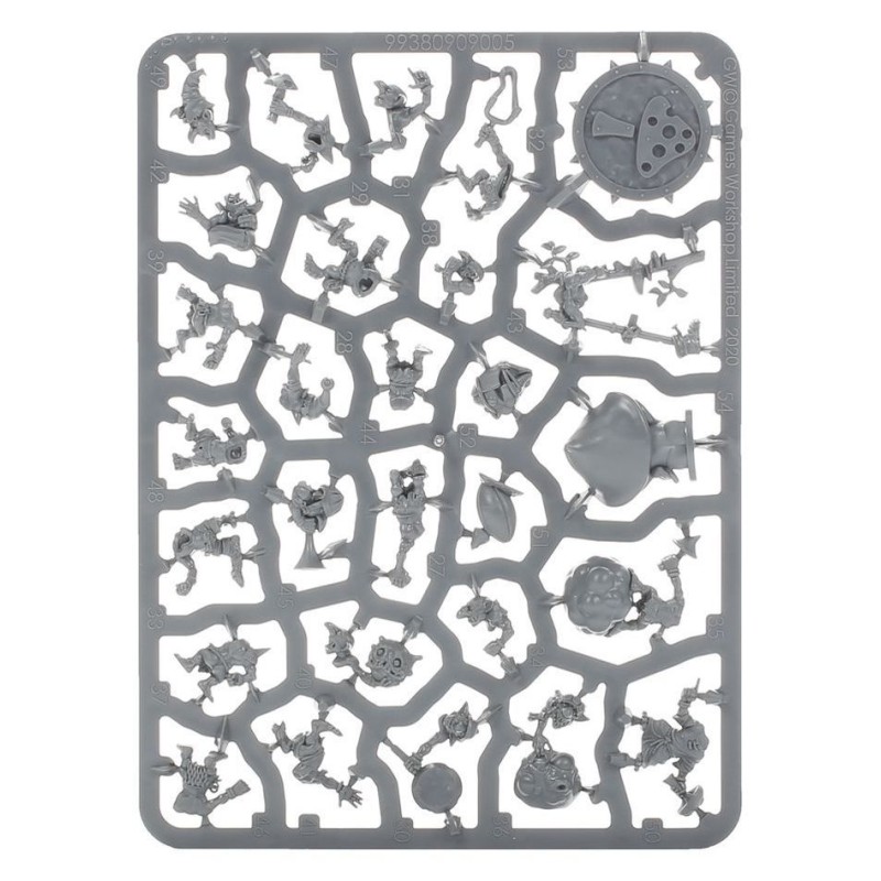 Ce kit plastique contient tous les composants nécessaires pour assembler les Crud Creek Nosepickers, une équipe de Snotlings à l'usage des parties de Blood Bowl. Le tout contient 12 Snotlings, 2 Snotling Fungus Flingas, 2 Snotling Fun-Hoppas, 2 Snotling Stilty Runnas, et 2 Snotling Pump Wagons! Sont également fournis 2 pions de tour, 2 pièces, 4 ballons à thème snotling, 20 socles ronds de 25mm, et 2 socles ronds de 32mm percés d'un trou.