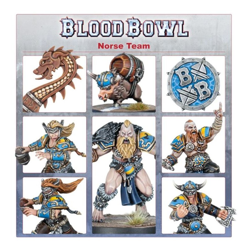 Ce kit se compose de 120 pièces plastique avec lesquelles vous pouvez assembler les Norsca Rampagers, une équipe nordique à utiliser lors de vos matchs de Blood Bowl. L'équipe se compose de 6 Norse Raider Linemen, 2 Beer Boar, 2 Norse Berserkers, 2 Ulfwereners et 2 Valkyries. Il inclut aussi 2 pièces Blood Bowl double face, 2 pions de tour et de relance, 4 ballons, et une feuille de 292 décalcos.