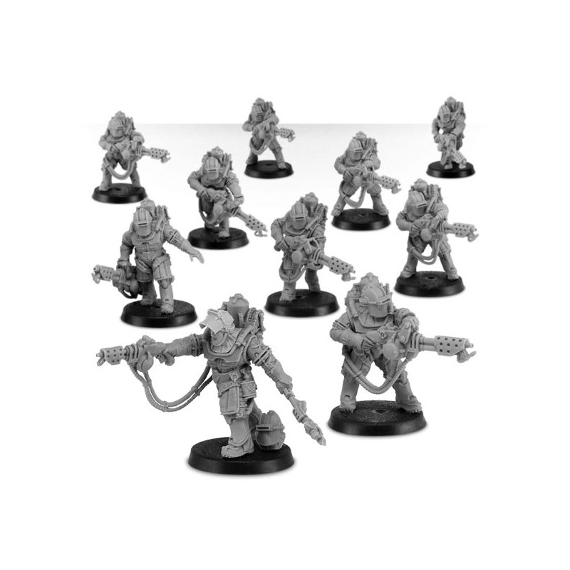 Description du produitTravaillant en conjonction avec les sections de lasers, la section de fusées d'Auxilia solaire fournit un soutien rapproché à son tercio d'infanterie. Qu'il s'agisse d'avancer sur des ennemis faiblement blindés, de prendre d'assaut des bunkers occupés ou de se retrancher derrière des lignes de défense Aegis, les jets de flammes de prométhium de leurs armes repoussent des ennemis bien plus nombreux qu'eux. Elles sont également souvent employées dans les actions d'abordage, nettoyant les couloirs de vaisseaux avec facilité.