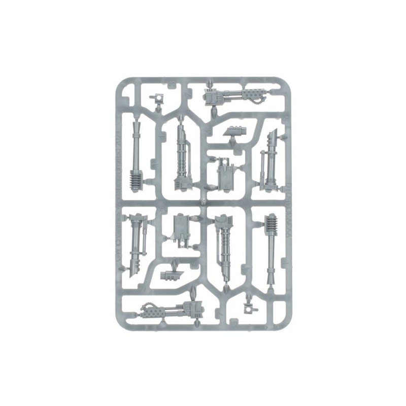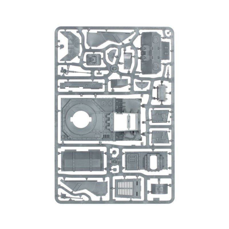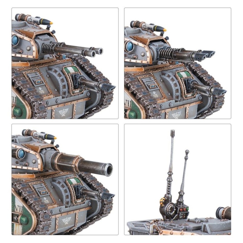 Le Char de Frappe Leman Russ peut être armé d'une des quatre armes de tourelles suivantes: un obusier, un canon laser jumelé, un autocanon Gravis ou un canon Vanquisher avec mitrailleuse coaxiale. Vous pouvez également choisir une arme de coque parmi cinq différentes: un bolter lourd, un canon laser, un autocanon, un multi-laser ou un lance-flammes lourd. Vous trouverez en option un missile traqueur, des projecteurs et une lame de bulldozer, ainsi qu'un lance-flammes lourd, un multi-laser ou une mitrailleuse sur pivot. Le kit propose également un cognis-signum pour faire de votre Leman Russ un Char d'État-major, avec dans ce cas la possibilité de lui ajouter un bouclier répulsif.