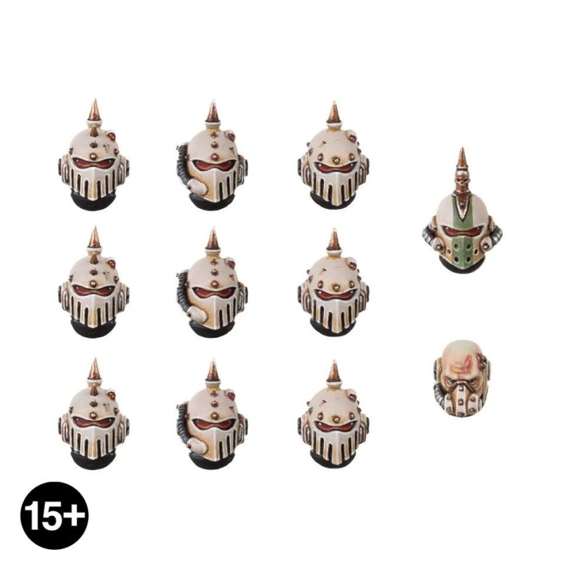 Ce kit d'amélioration peut être utilisé pour personnaliser les légionnaires du set MKVI Tactical Squad avec de nouvelles têtes, en remplaçant les casques à bec standard par des grilles sinistres caractéristiques de la Garde de la Mort. Le kit comprend neuf têtes casquées dans trois designs différents, chacune avec une sinistre pointe de tranchée et des rivets industriels, ainsi que deux têtes conçues pour les sergents - une tête nue avec un recycleur, et un casque avec une grille unique et une pointe imposante. Répartissez ces éléments dans votre armée pour ajouter un peu de saveur à la Légion XIV, ou équipez des escouades entières pour obtenir un look d'élite unifié.