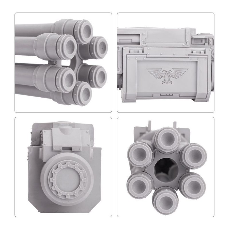 Ce kit de 12 pièces en résine comprend une gatling blaster Battle Titan complète, à utiliser avec les Reaver Titans, les Chaos Reaver Titans et les Warbringer Nemesis Titans.